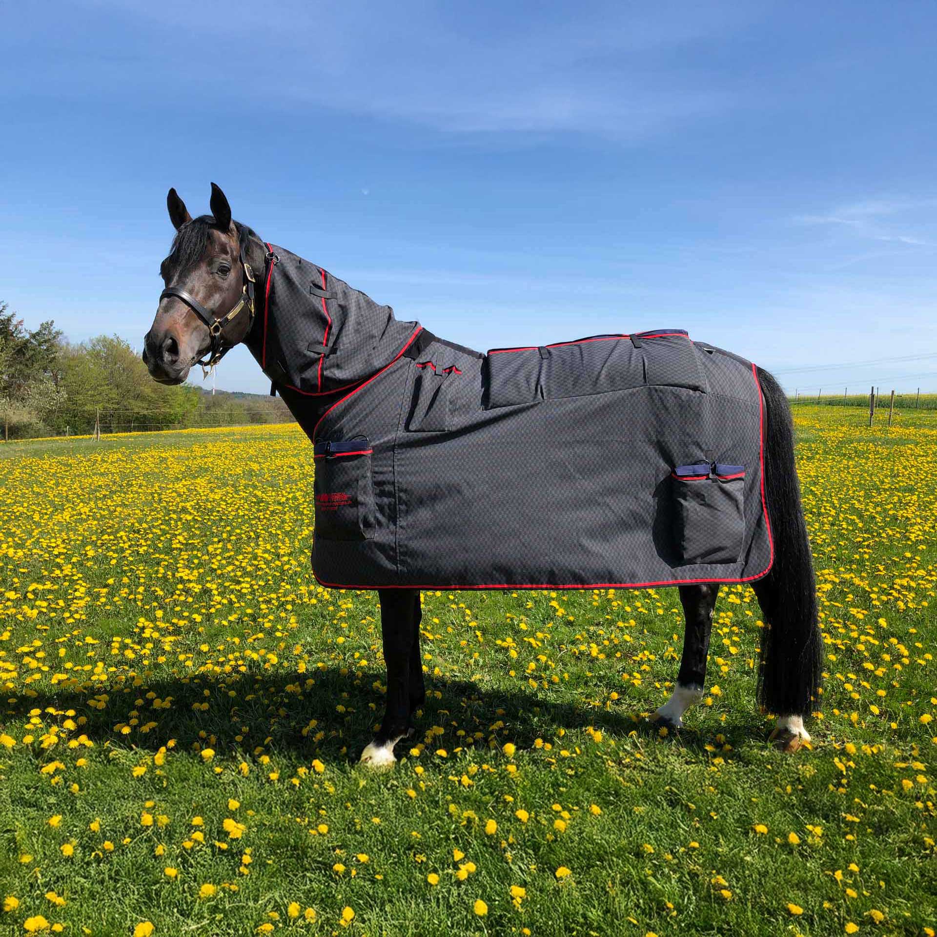 ein Pferd, das in einem Löwenzahnfeld mit Magnetfeldmatte steht